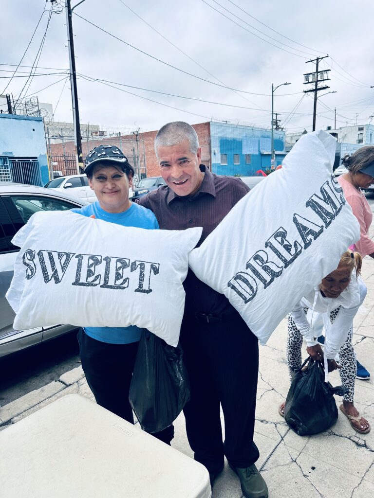 Thanks to a generous textile company, we were able to distribute comforters and pillows to the homeless dtla.